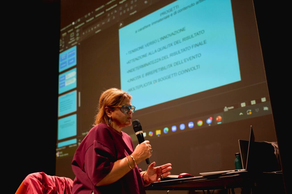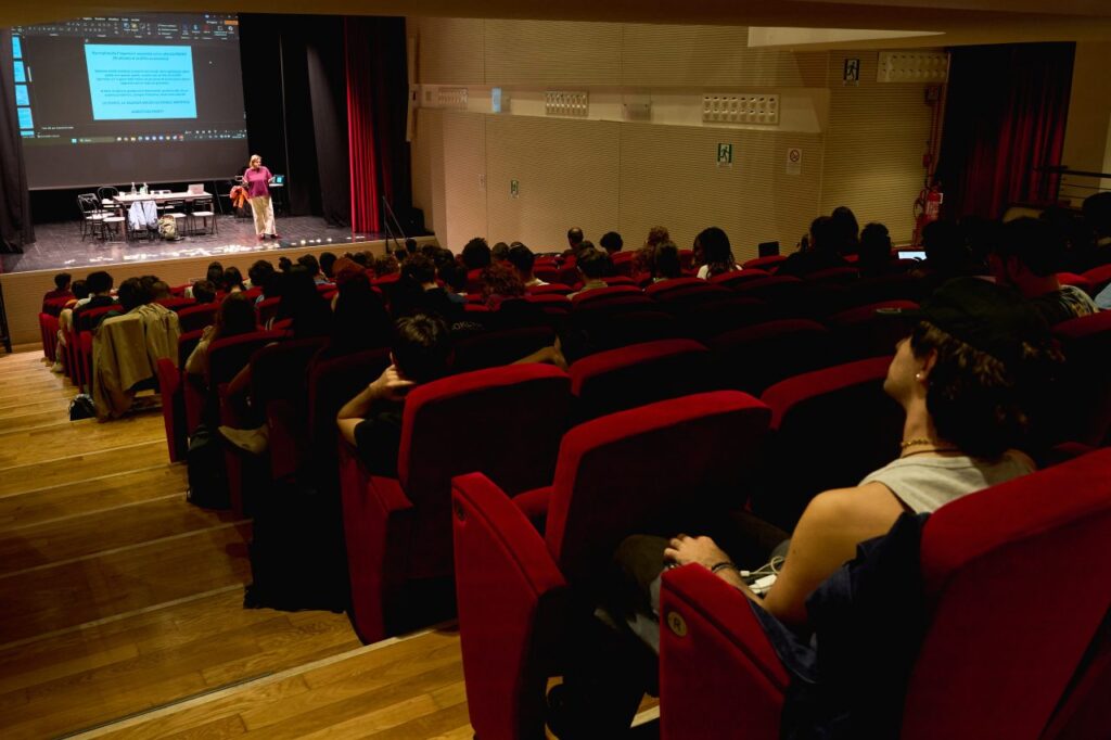 In alcuni scatti vediamo le artiste e gli artisti presentare le proprie tracce progettuali alla platea. È qui che il diario si riempie di luce e volti nuovi, diventando un dispositivo di scambio orizzontale.